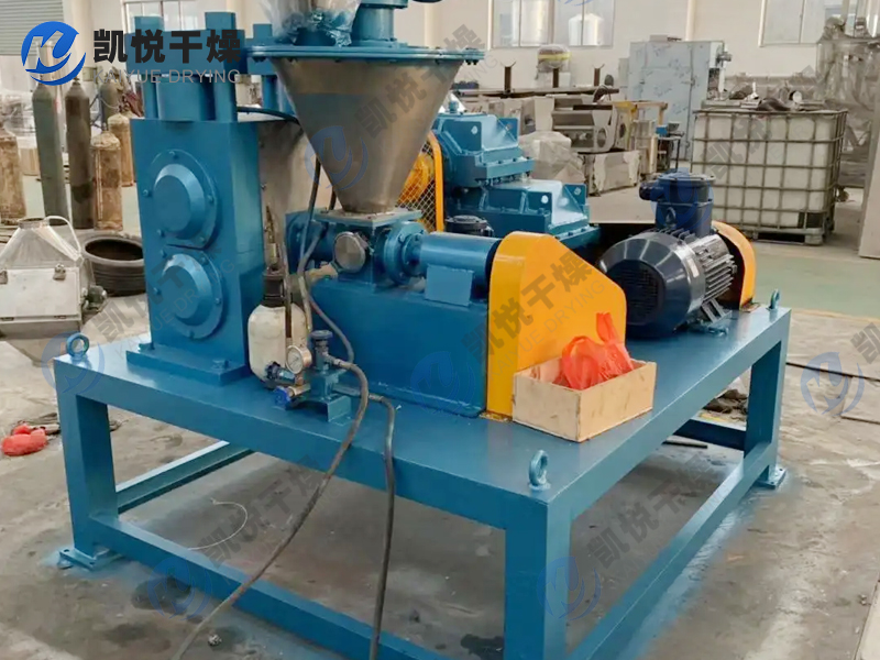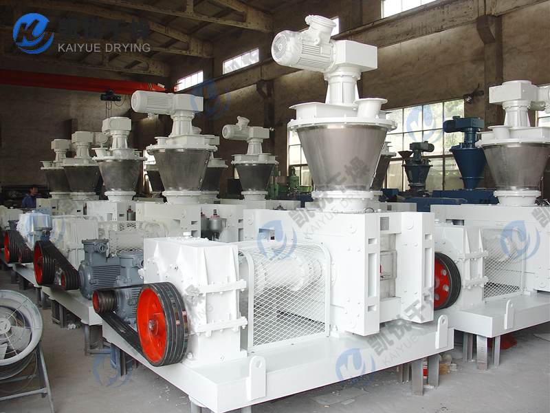 粉状物料由振动给料斗经横向螺旋送料器定量,均匀地加人轧片主料斗,使轧片主料斗内保持恒定的料粒,然后由轧片主料内的纵向锥螺旋对粉料进行预压缩并输送到两只压辊的弧形槽口,两只压辊表面均匀分布形状相同的半扁圆形弧槽或菱形槽,通过一对齿轮的啮合传动,使两只压辊等速,反向旋转,将锥螺旋输送至槽口的物料咬入槽内并瞬间强制压缩,物料经过压缩后随着压力逐渐减小在其弹力及重力作用下,从槽内脱落,进入破碎整粒系统,然后根据用户的粒度要求过筛、分级,得到符合质量要求的均匀颗粒状产品,筛下粉重新返回振动料斗循环利用。