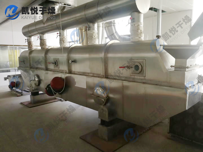 物料自进料进口进入机内,在振动力作用下,物料沿水平面流化床抛掷,向前连续运动,热风向上穿过流化床同湿物料换热后,湿空气经旋风分离器除尘后由排风1:3排出.干燥物料由排料进口排出。