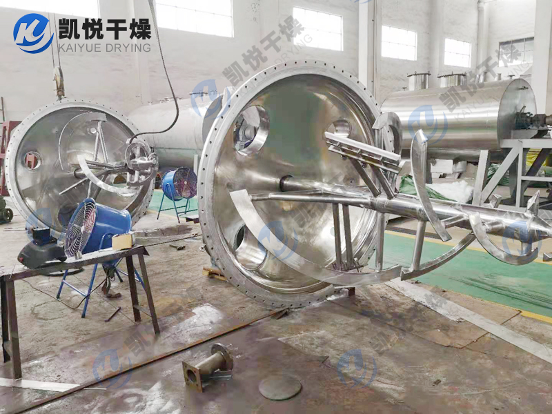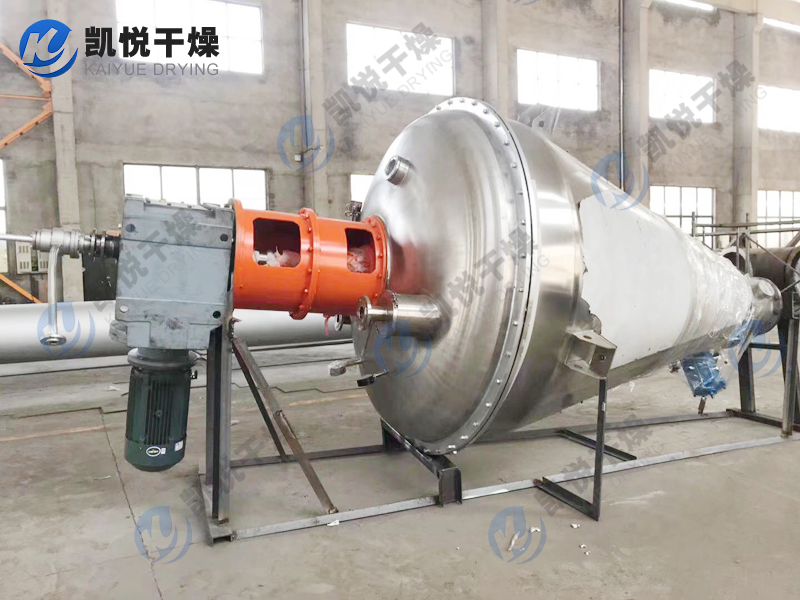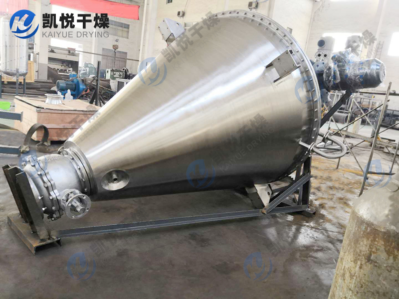 本机由加热锥体设有加热夹套,热源为热水、导热油或低压蒸汽,从而使锥体内壁保持一定的的温度。变频调速电机经平行斜齿轮减速机,驱动单螺带搅拌器旋转,带动物料沿锥型筒旋转并自下而上提升,物料到达最高点后由重力和惯性作用,自动流向旋涡中心回到锥型筒体底部,整个过程使物料在锥型筒体内强制加热,相对对流、掺混,热量在物料中相互扩散,使物料作全方位的不规则往复运动,完成物料同单螺带和筒壁表面进行高频率传热交换,在短时间内达到加热干燥的效果。从而使物料内部水份不断蒸发,在真空泵的作用下,水蒸汽由真空泵引出,如须回收液体可加冷凝器、回收液储罐回收。干燥完成后,打开下部的出料阀出料。